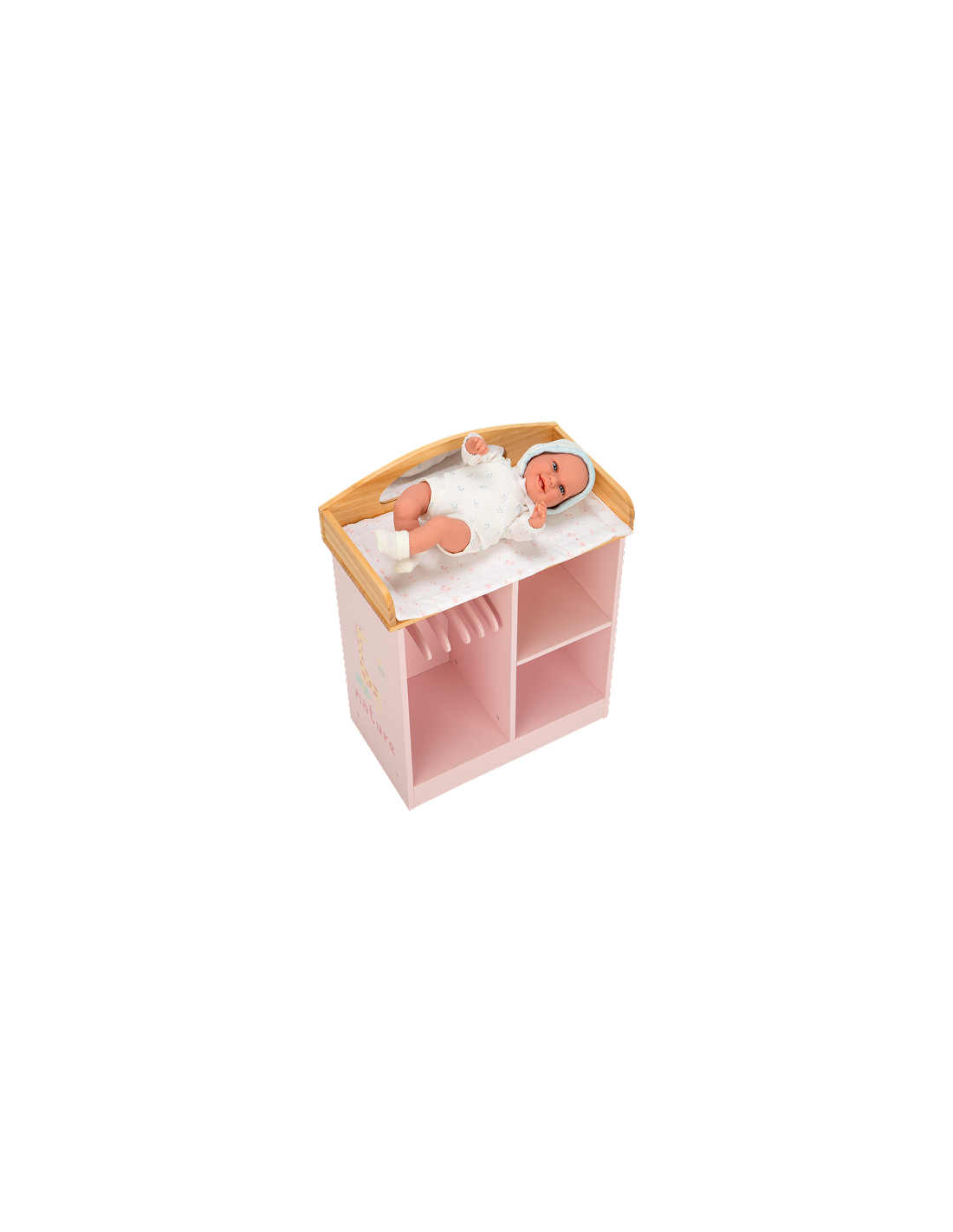 The Nature Coat Rack / Changing Table by Muñecas Arias is designed for the little caregiver who loves a tidy and efficient nursery. Part of the eco-conscious Nature Collection, this piece maximizes play value by blending two essential nursery functions. The top surface serves as a realistic changing station, while the open-access lower section serves as a wardrobe rail to keep your doll's favorite outfits on display and within reach. Following the collection’s signature Nordic aesthetic, the unit is finished in a crisp white and natural wood palette that suits any modern home decor. This furniture piece encourages children to practice daily routinesâ€â€from diaper changes to choosing the perfect outfitâ€â€fostering independence and fine motor skills. The set includes 5 premium wooden hangers specifically designed for doll clothing. Crafted in Spain from high-quality wood and finished with child-safe, non-toxic paints, this durable piece is built to withstand years of imaginative play.