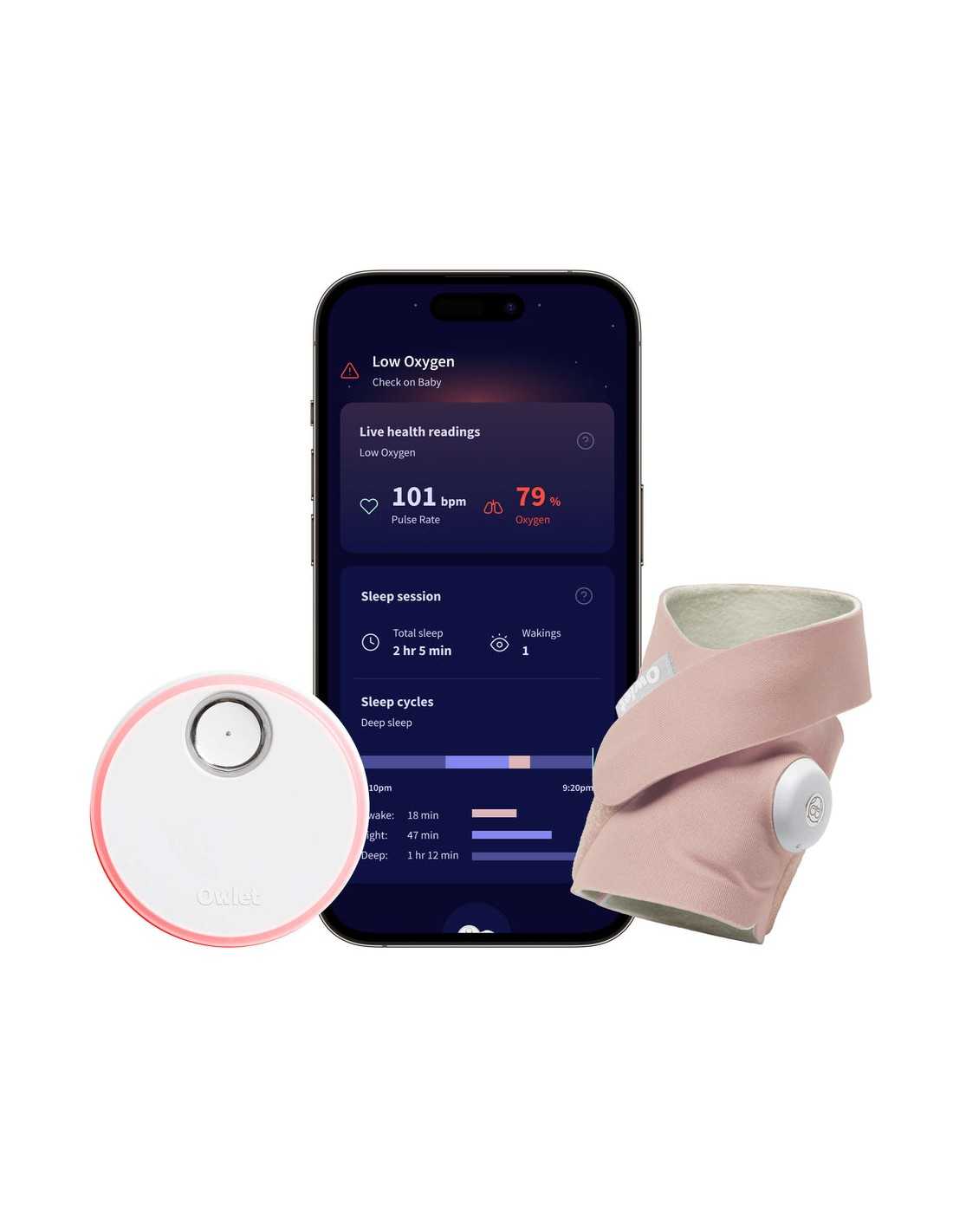 - Receive real-time notifications if any health readings fall outside the preset ranges through the Owlet Dream App and base station.