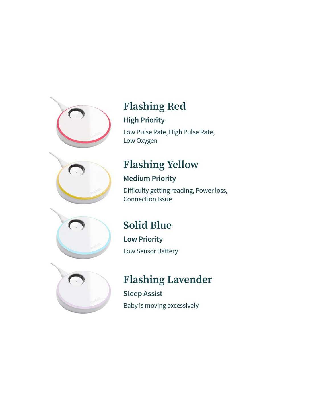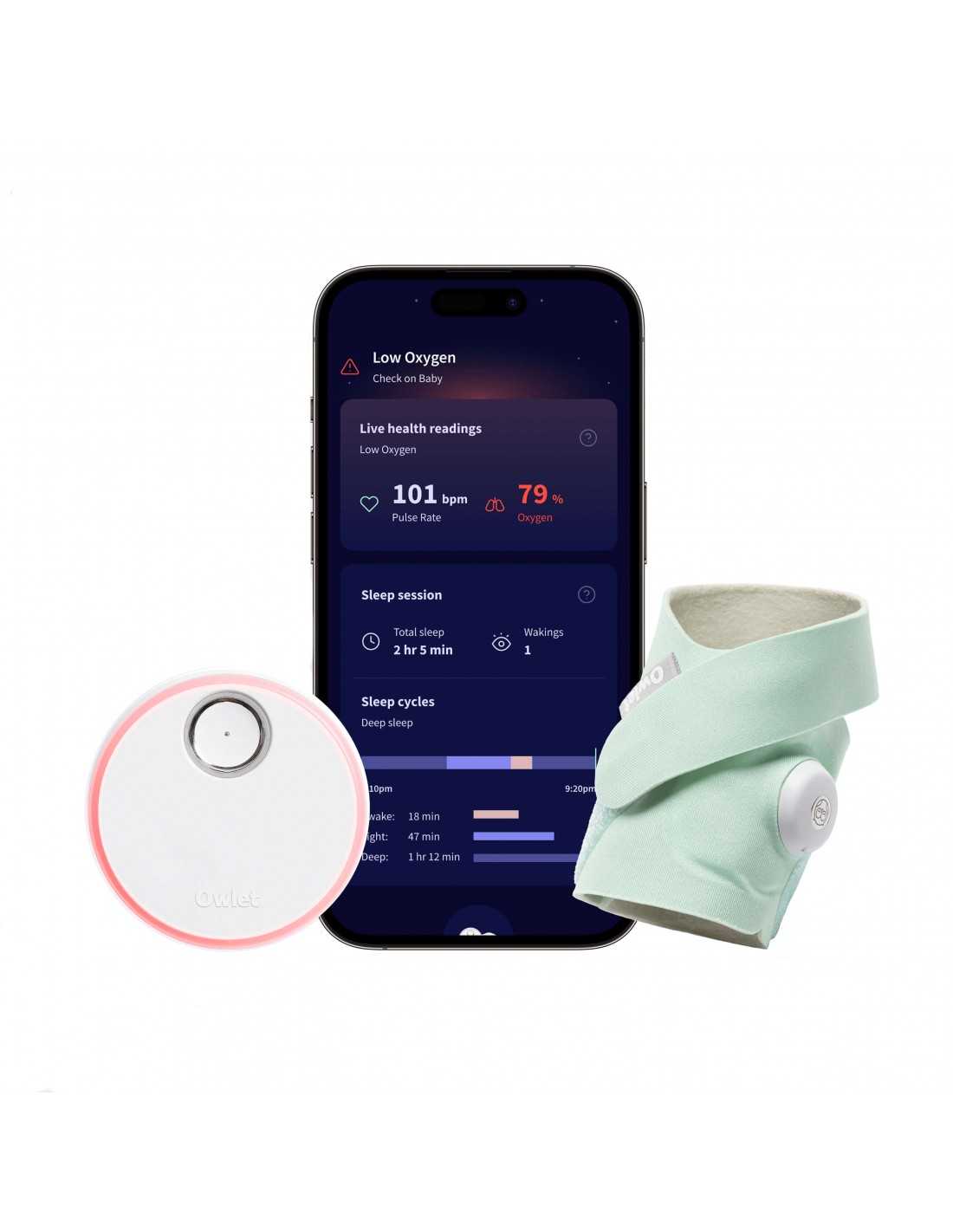 - Receive real-time notifications if any health readings fall outside the preset ranges through the Owlet Dream App and base station.