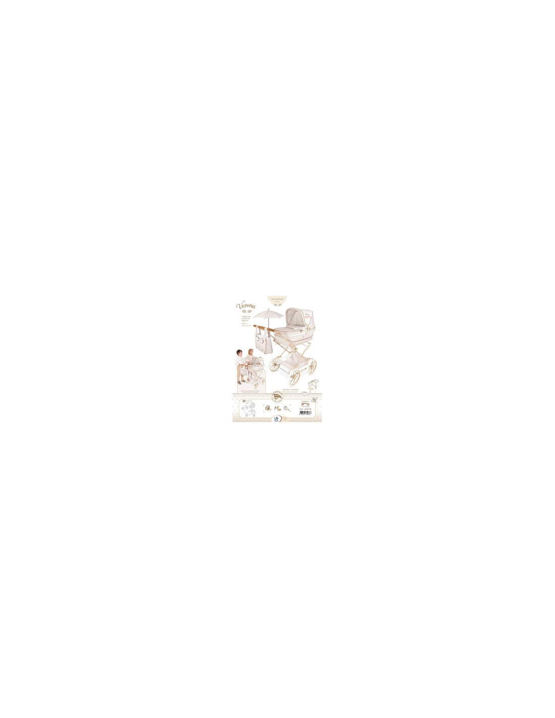 - The pack includes: White and beige reborn doll stroller with special print from the Verona line, folding structure, matching umbrella, lower storage tray, large classic style wheels with silent foam cover, padded handlebars, rigid carrycot, hood with tensioners, matching car bag and more luxury details.
