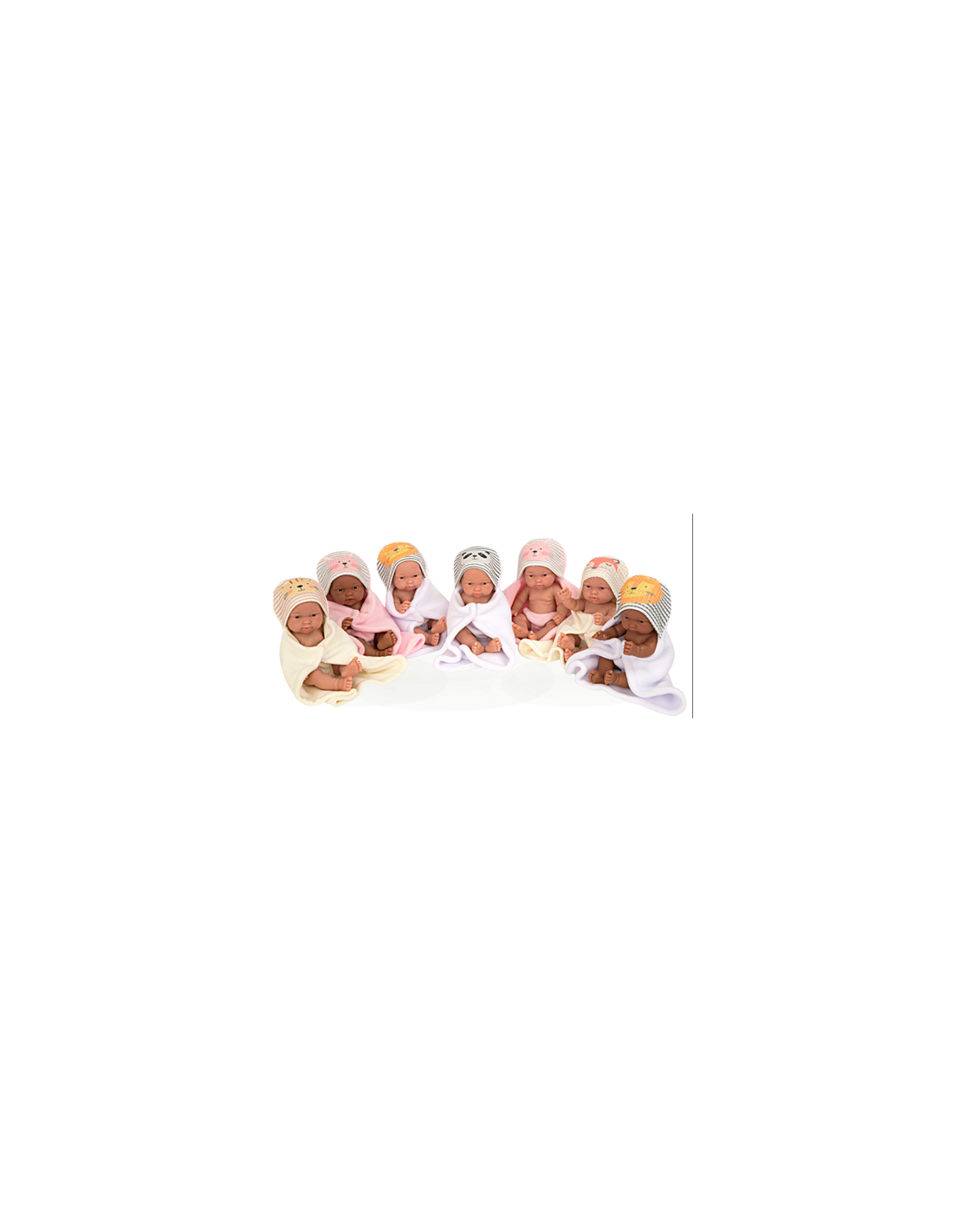 The Arias Display 26 cm Pillines is a professional retail solution designed to showcase the beauty and quality of the Pillines series. This bulk display includes 9 individual dolls, each measuring 26 cmâ€â€the perfect size for toddlers and young children to hold and nurture. Crafted entirely from premium, soft-touch vinyl, these dolls are durable, easy to clean, and feature realistic details that capture the sweet essence of a newborn. Each display typically includes an assortment of boy and girl dolls (anatomically correct) dressed in various high-quality Spanish knit outfits, ranging from classic pinks and blues to trendy neutral tones. The compact display unit is designed for countertop or shelf placement, allowing customers to easily see and feel the quality of the Muñecas Arias brand. Like all authentic Arias dolls, each Pilline is lightly infused with a signature vanilla scent and is 100% manufactured in Castalla, Spain. This 9-unit set is ideal for toy stores, gift shops, and boutiques looking to offer a high-quality, artisanal Spanish product in an accessible format.