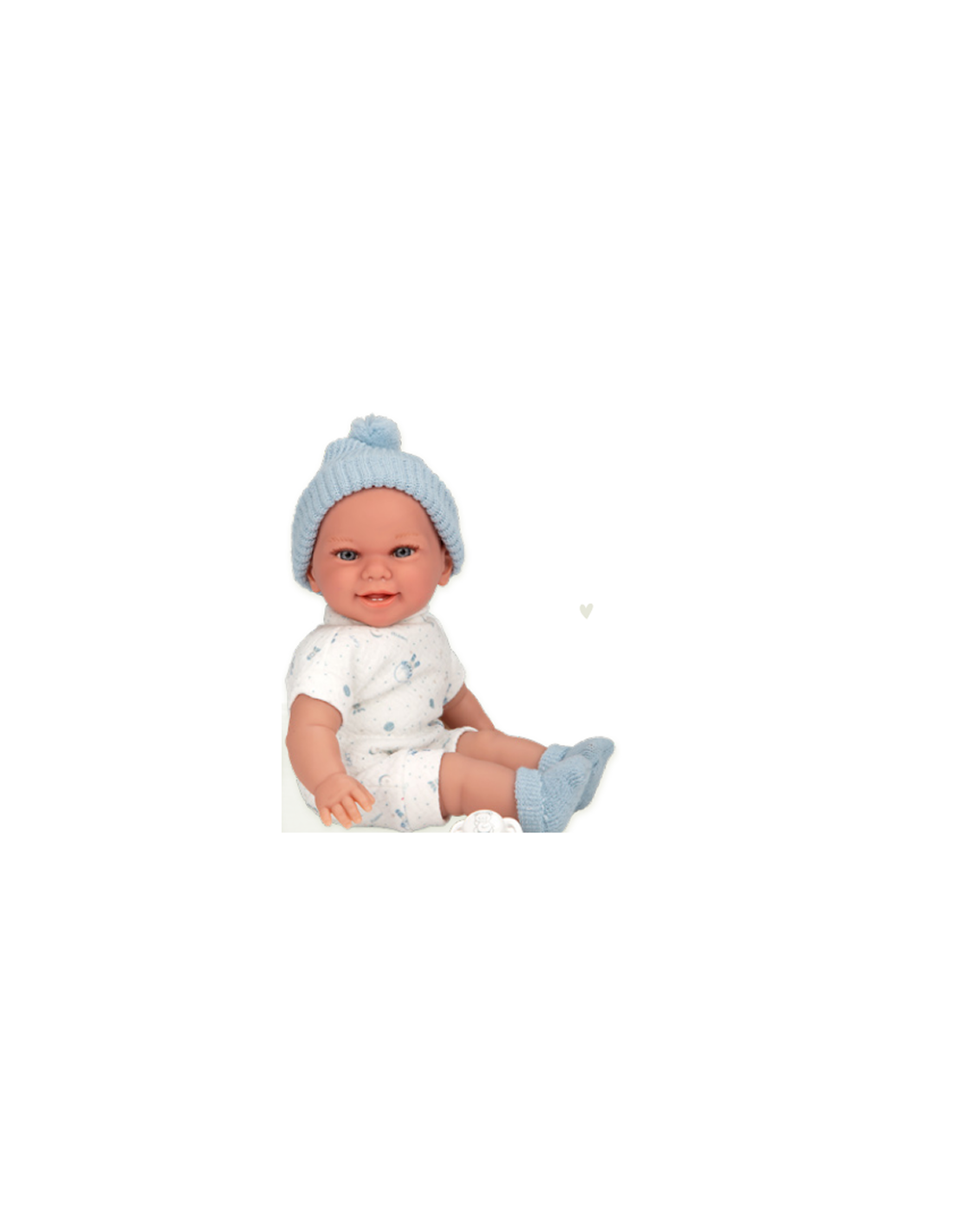 Pay by Humm UKMeet Babyto Blue, a cheerful 34 cm interactive doll from the Muñecas Arias Elegance collection. This adorable baby boy features a built-in laugh mechanism that triggers sweet, realistic giggles with a gentle press of his tummy. Dressed in a cozy blue-and-white knit outfit and presented in a "Try Me" box, Babyto Blue is designed to bring instant smiles and interactive fun to every playroom.