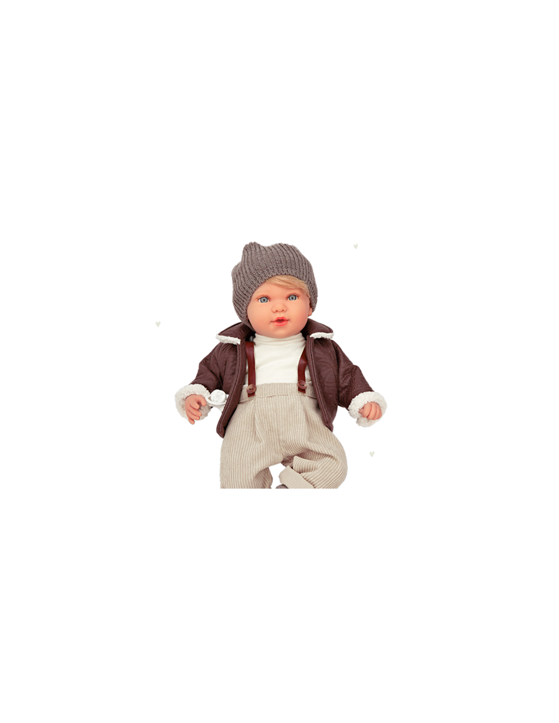 The Elegance Irio Brown with 14-Sound Mechanism is a masterpiece of interactive doll design. Measuring 45 cm, Irio stands out with his soft, realistic hair, allowing for gentle styling and hair-care play. His most advanced feature is the internal sound module capable of producing 14 different baby sounds, including "Mama," "Papa," giggles, and soft crying. This mechanism is magnetically linked to his pacifier; when the pacifier is removed, Irio will begin to interact, and he only quiets down once the pacifier is returned. For an easy gifting experience, he arrives in a "Try Me" open-window box, so his realistic sounds can be tested immediately. Dressed in high-quality Spanish knitwear in a trendy brown-and-cream palette, Irio also features a soft cloth body and vinyl limbs for a cuddly yet realistic feel. Hand-manufactured in Castalla, Spain, he carries the signature light vanilla scent that Muñecas Arias is famous for.