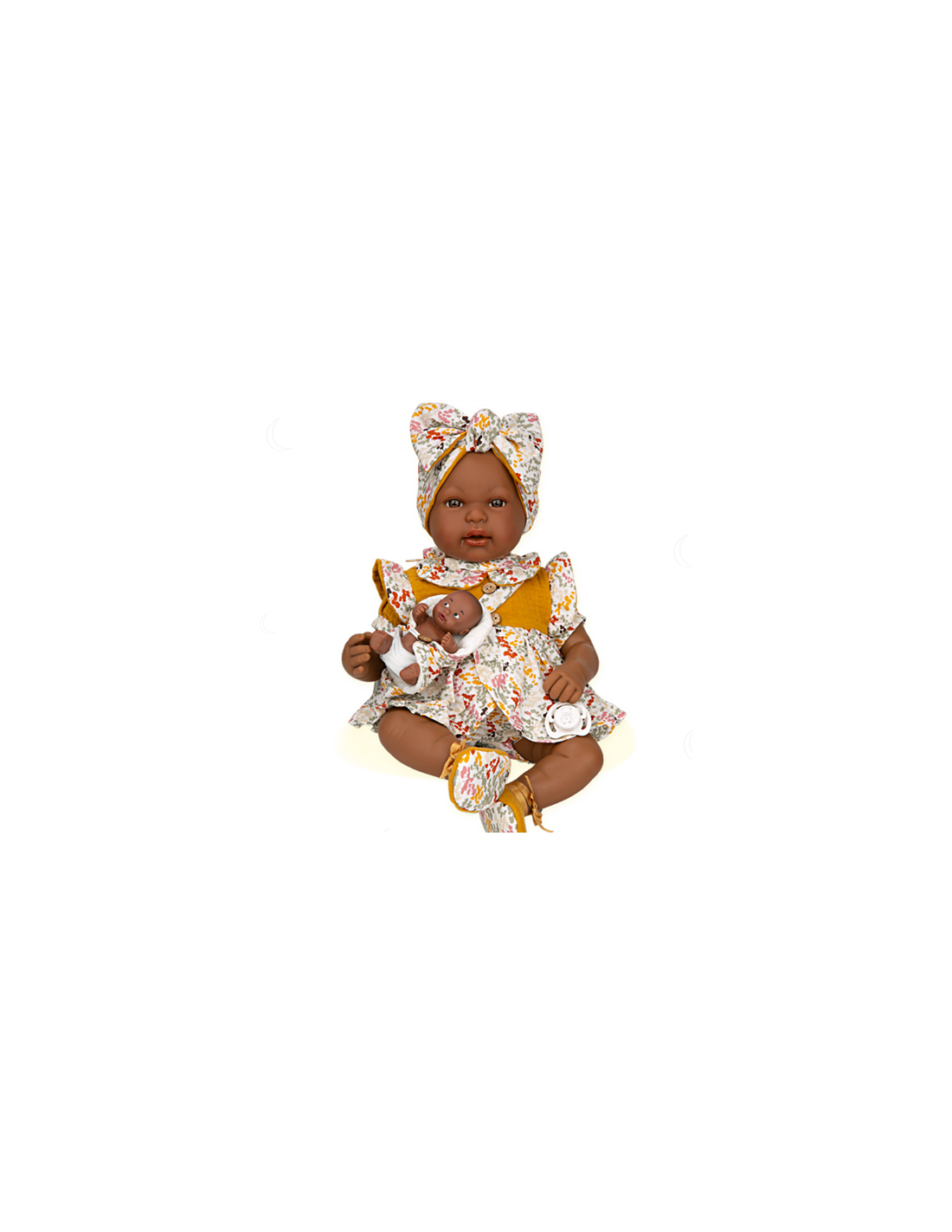 Pay by Humm UKDiscover the unique beauty of Mies Mulatto, a stunning 45 cm weighted doll from the Muñecas Arias Elegance collection. Featuring a gorgeous mulatto skin tone and dressed in a stylish Aran mustard-and-gray knit ensemble, Mies is handcrafted in Spain to provide a realistic "real baby" feel. Complete with a soft matching blanket, she is a premium choice for children and collectors alike.