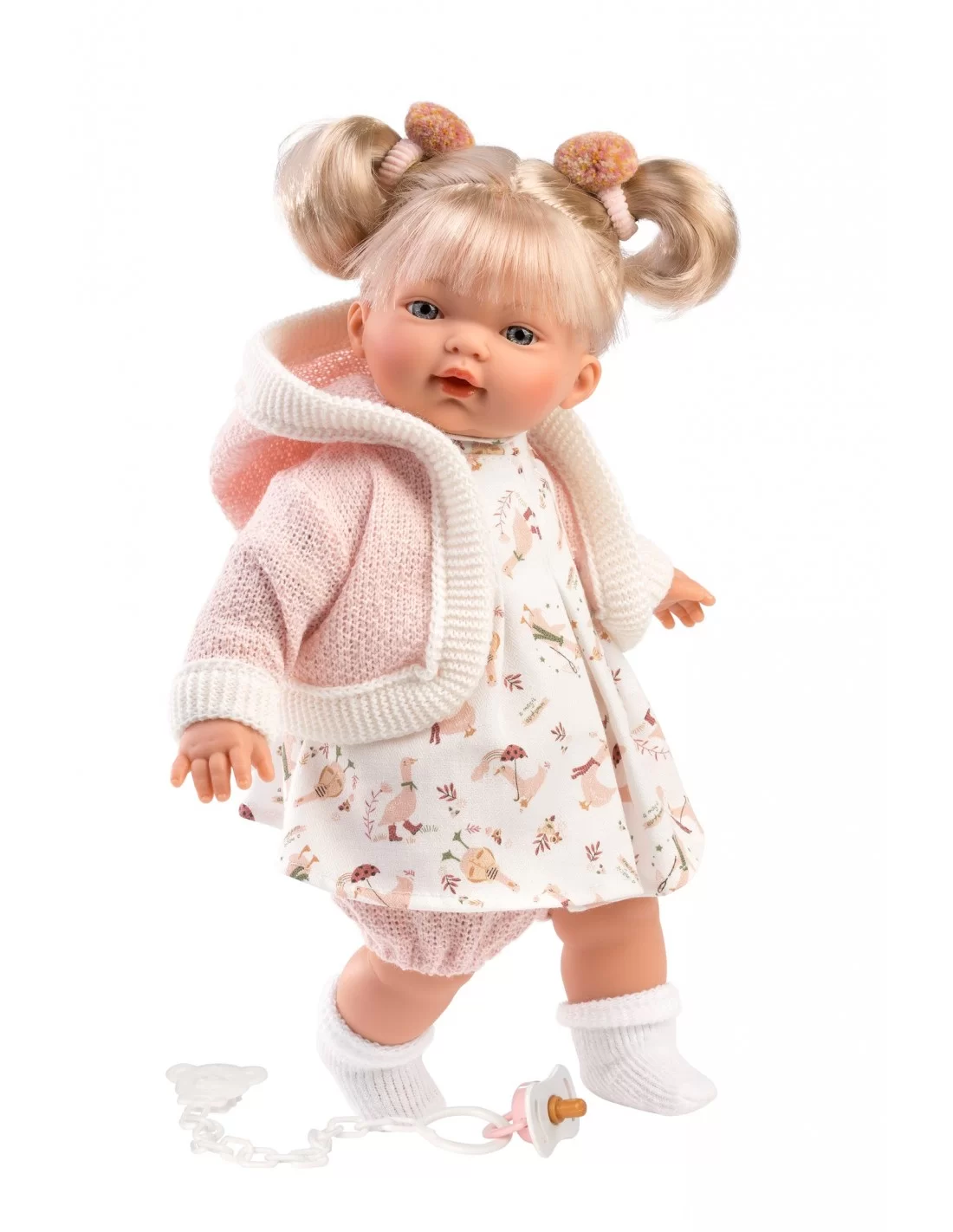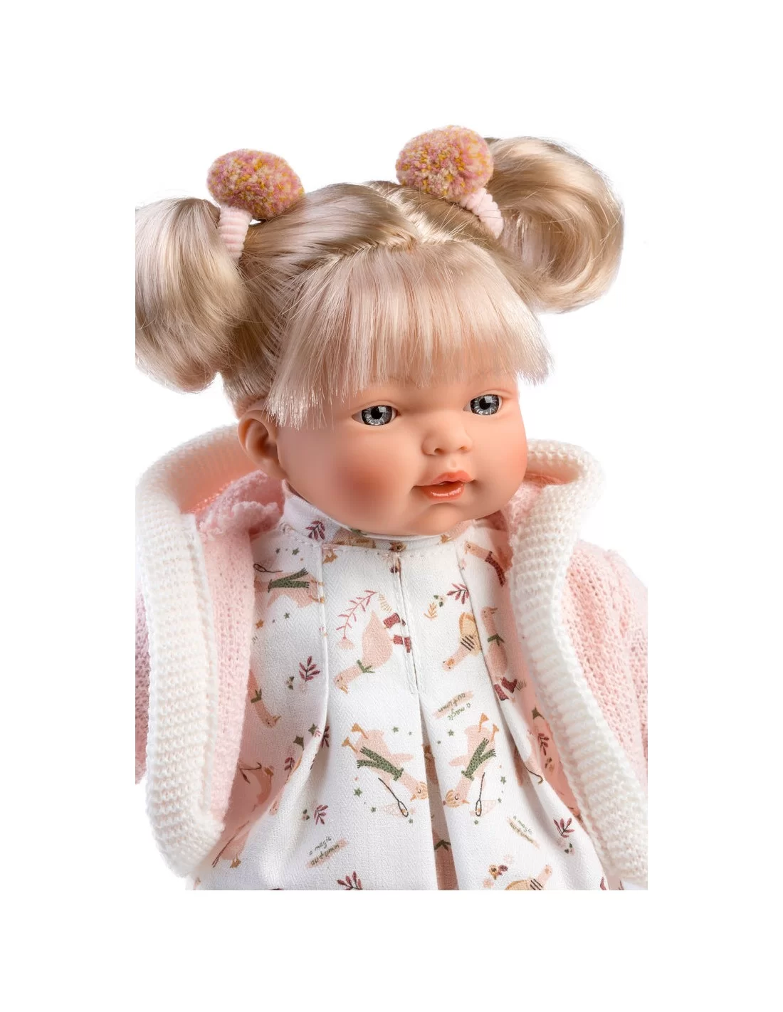 Roberta crying doll is 33 cm tall. The mouth, handles and legs are made of a delicate, pleasant to the touch vinyl, and the belly is soft, which makes the doll perfect for hugging. Blue eyes, a tiny nose, ears, small lips and chubby cheeks are the features of this doll. The doll is packed in a decorative cardboard box, so without unnecessary additional packaging, it can be presented as a gift.