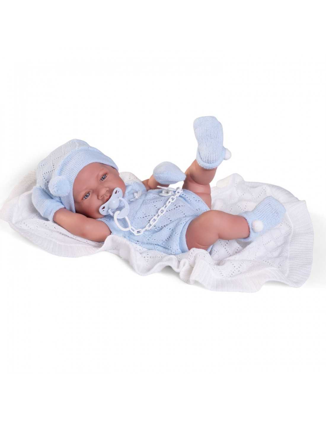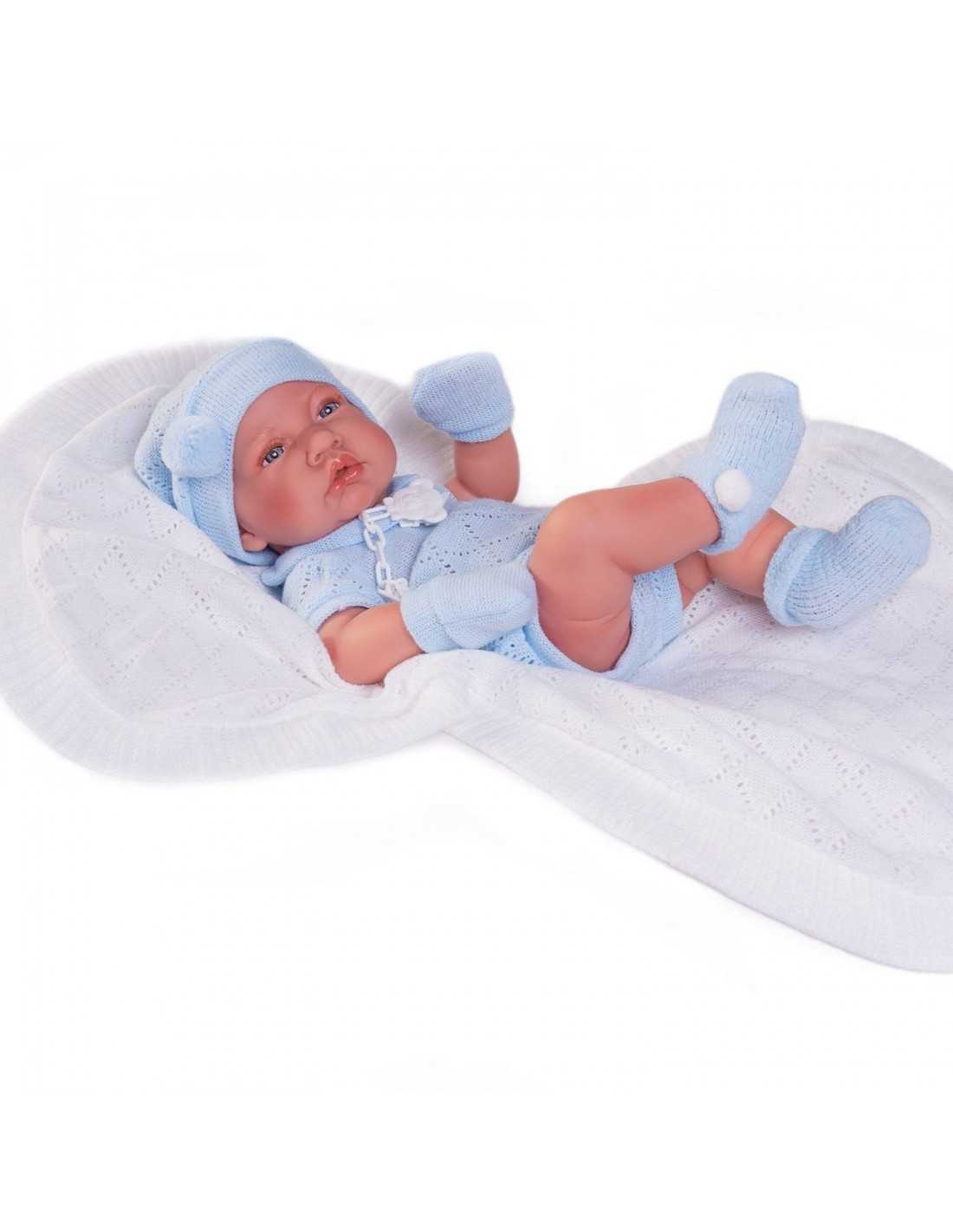 This adorable baby, dressed in cosy blue knitted clothes and wrapped in a soft white blanket, is ready to be held and cradled in your arms. To complete his outfit, he comes with matching mittens and socks for extra cuteness!
