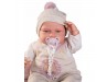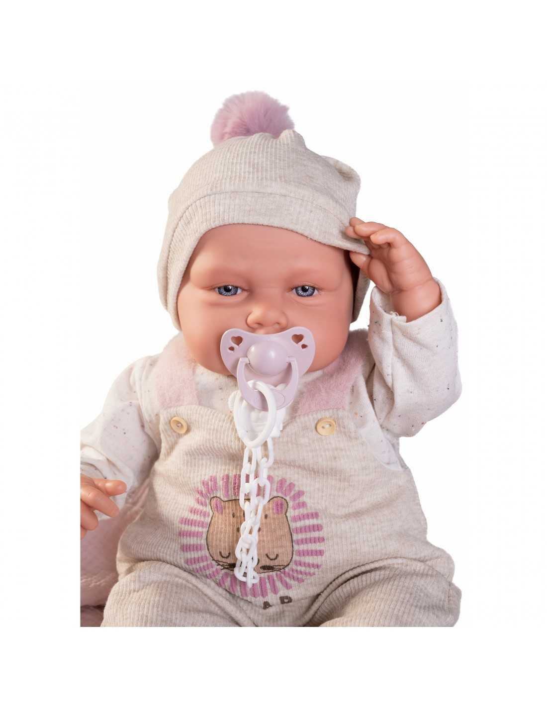 Soft pompom hat, Cosy jersey top, Stylish beige knitted dungarees, Blanket, Realistic pacifier with chain.