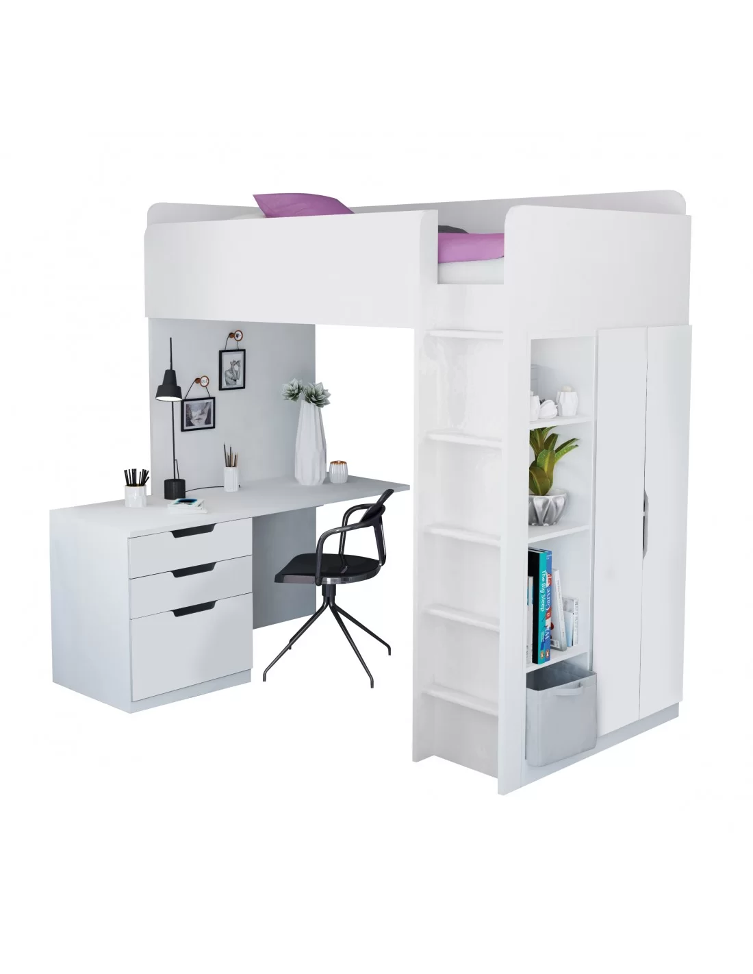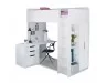 The High Sleeper Loft bed offers a full bedroom solution in a single unit. Taking-up no more floor space than a standard size bed. Theres a generous size wardrobe with hanging rail, a desk and drawer unit that can be neatly tucked under the space beneath the sleeping area or turned perpendicular to give a little extra space for a chair. Once your child is aloft, the bed has high side rails for added safety. The bed is made from quality, wood grained particle board, finished in a durable wipe clean surface.
