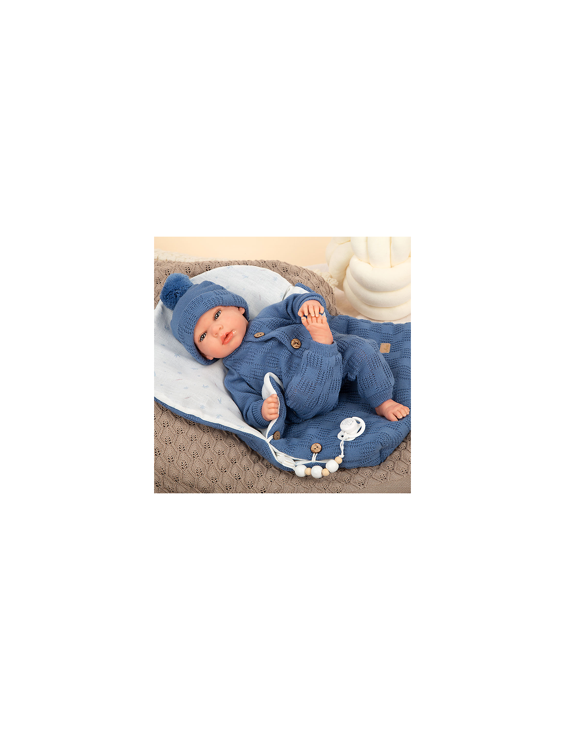 Pay by Humm UKReborn de 40 cm ALBERTO. Bebé realista de vinyl y cuerpo blando con ropita de lana en tono azul, y saco de dormir con estampado a juego. Incluye saco de dormir, chupete, chupetero, pañal, libro de familia y certificado de autenticidad.