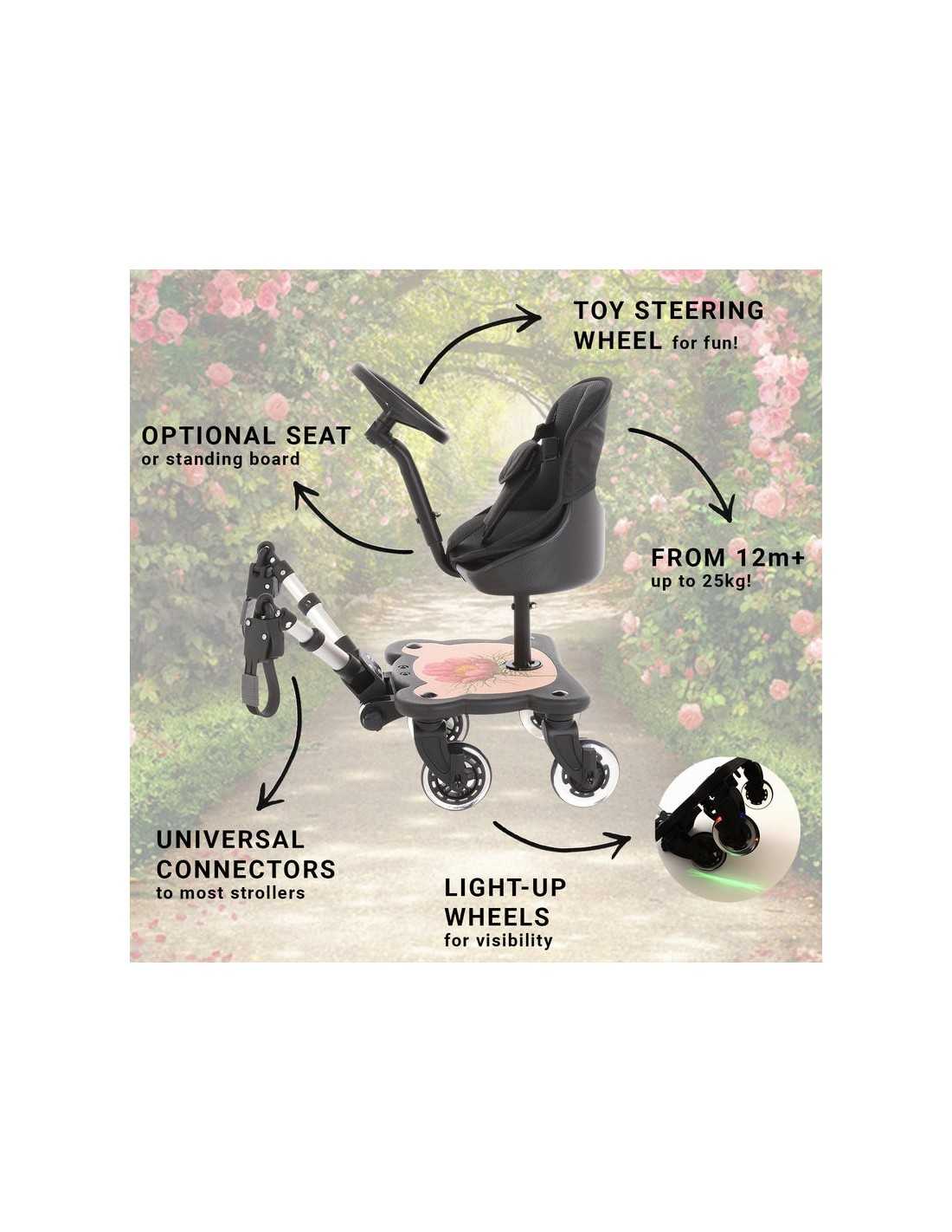 Roma 4 Rider Toddler Seat - 2 in 1 buggy board and seat with steering wheel plus 4 wheels for better stability.